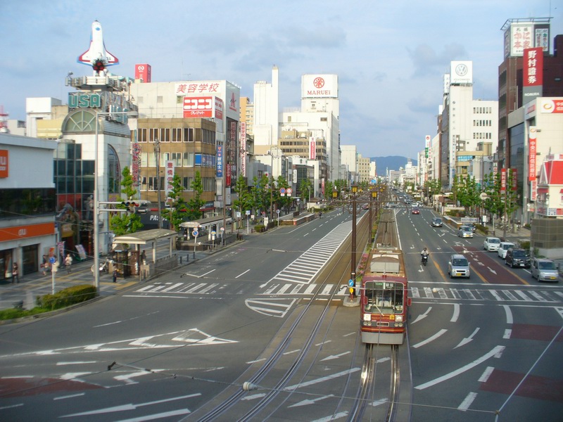 豊橋駅東口ペデストリアンデッキからの駅前大通。中央に「豊橋鉄道市内線」の車両。