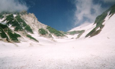 天気は曇りだが、時々ガスが切れて稜線が見える。まずまずの天気。身支度をし、雪渓を登り始める。