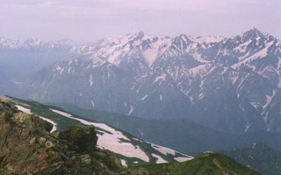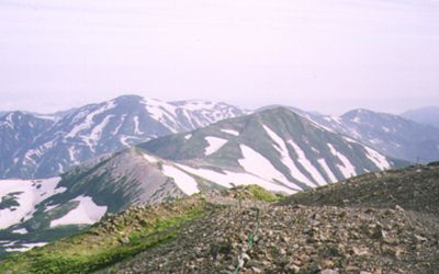 そこからもゆっくり登り、白馬山頂へ。曇りながらも展望はよく、槍・穂高や頚城三山、浅間山あたりまで見えたが、それ以上に素晴しいのが、足下の白馬三山の展望であった。今度登るときは、ぜひ向こうへ行きたいものである(今回も考えたが、残雪が多いのと、猿倉からのバスがないので断念した)。