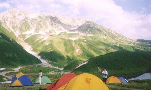 雷鳥平は周りを大きな山に囲まれたとても広いテント場である。この日は100張くらいのテントがあった。