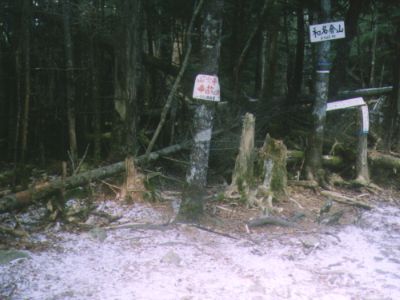 山頂の手前は道がわかりにくいが、注意していれば迷うほどでもなかった。 山頂は、細い樹木が密生した深い樹林の中にぽっかり開いていて薄暗い。 雪でうっすら白くなっていた。気温-6℃。 |