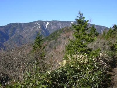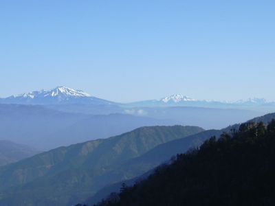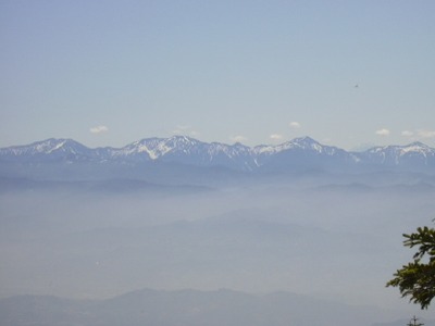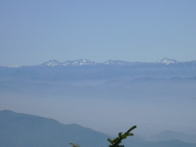 わずかに登り、姥ナギのところから残雪の白山や御岳、穂高が見える。 更に大判山では南アルプスが見えてくる。朝早いので、とても展望がいい。 |