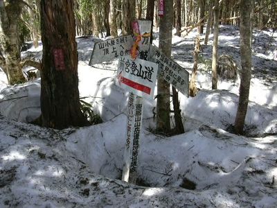 天狗ナギを過ぎたあたりから完全に雪道になり、軽アイゼンを着ける。 積雪は多い所で1m以上はあり、赤テープを辿りながら登る。 |
