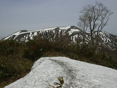 | いったん下って、最後の登り。雪渓上の急な道を慎重に進む。ザゼンソウやカタクリが咲いている。コバイケイソウの芽がでていてかわいい。 |