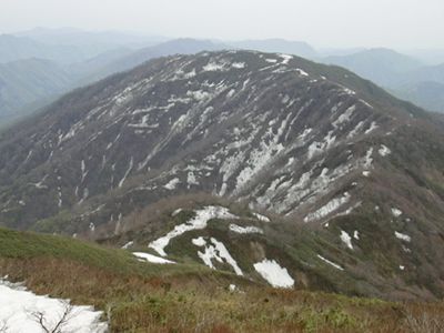 とても暑く、汗をだらだら流しながら登り、ようやく前山。残雪に覆われている。 右側に白山と手前に荒島岳、正面に能郷白山が大きい。 残雪を登る人がアリのように見える。 |