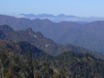最後に急な登りを頑張ると、帳付山頂。樹林に囲まれて展望はほとんどないが、少し西側に進むと岩場で展望よし。 ビールを飲み、ラーメンを食べる。 去年登った諏訪山が間近に見え、あの尾根を歩いたなと思い出す。その奥にジャンボ機が墜落した御巣鷹の尾根。 |